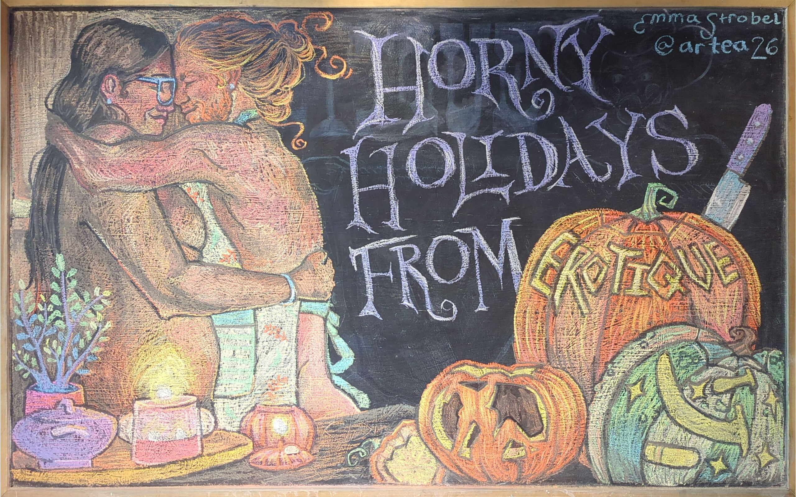 Emma Strobel is our Autumn Artist! Check her out on Instagram. @artea26 As always, the art Emma produced is an utter delight! It’s symbolic, emotive, thematic, representative, and harmoniously diverse. Come on in to see this work in person and treat yourself to a Horny Halloween!